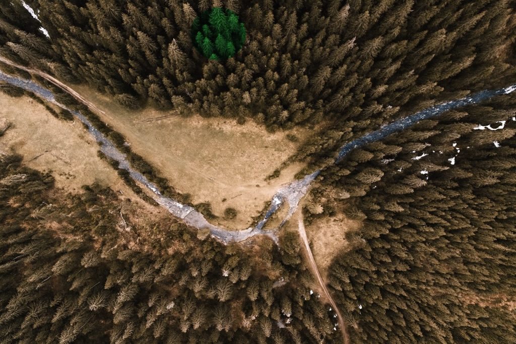 This drone shot captures a unique spot in the forest where a patch of trees has remarkably remained green, even as the surrounding woodland has turned gray-brown for the season. The contrast creates a striking natural anomaly visible only from above.
