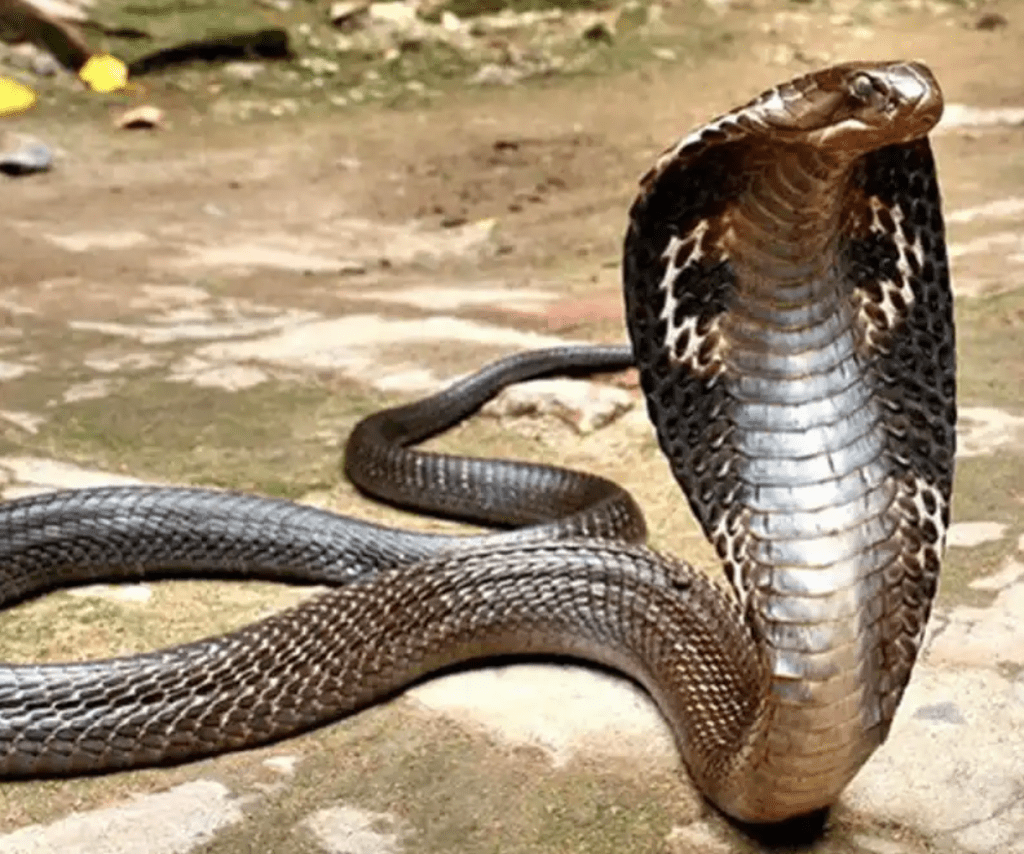 The king cobra, the longest and one of the most venomous snakes on earth, is found in the dense forests of India and throughout Asia. It can reach lengths of over 5.5 meters. In everyday life, king cobras rarely attack humans, preferring to feed on small animals and other snakes. However, their venom contains so many neurotoxins that it can even kill an elephant. The survival rate of a human bite is only about 40%.