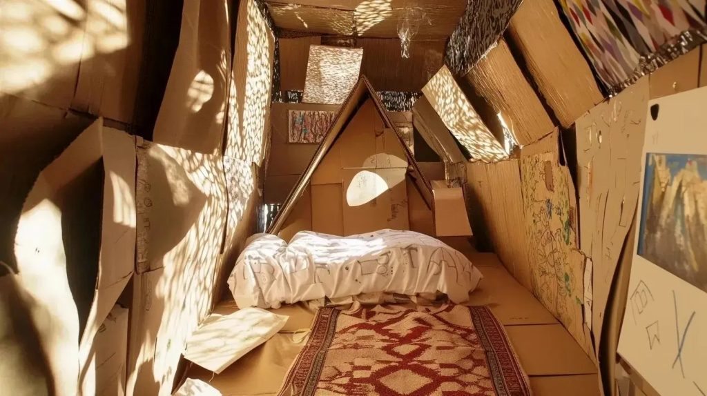 The sleeping area is practical but straightforward: a bare mattress lies on the floor, surrounded by cardboard walls to keep the heat in. The design is surprisingly comfortable, showing that even simple materials can feel nice when you put some thought and care into them.