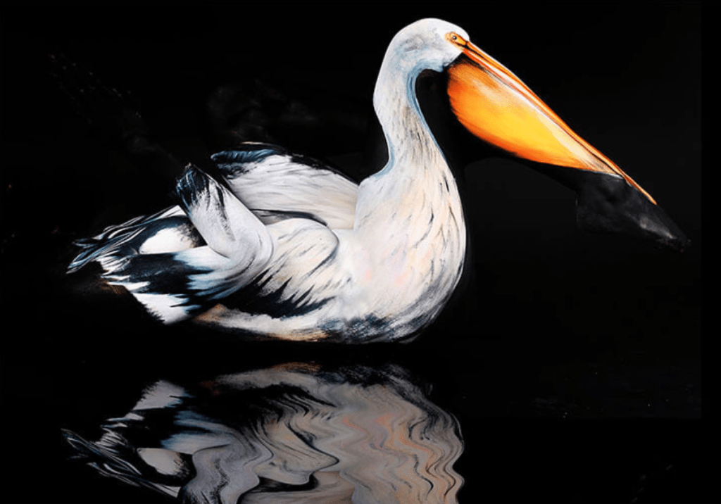 At first glance, it appears to be a bird reflected in the water. However, upon closer inspection, the illusion is revealed: part of the image is a human leg, masterfully disguised as a background.