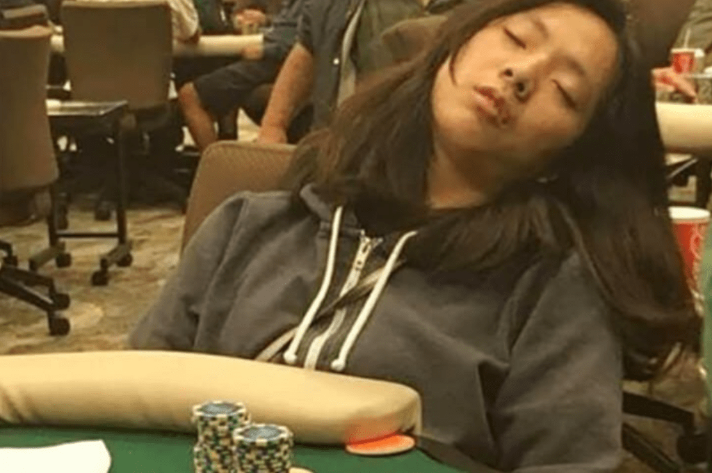 It’s hard to tell from this woman’s expression what’s really going on. Perhaps she stayed up all night, or possibly, on the contrary, she’s enjoying a sweet slumber right during the game. Another theory is that she’s just pretending, carefully observing her opponents. Whatever the case, falling asleep at the poker table is rare, but not impossible.