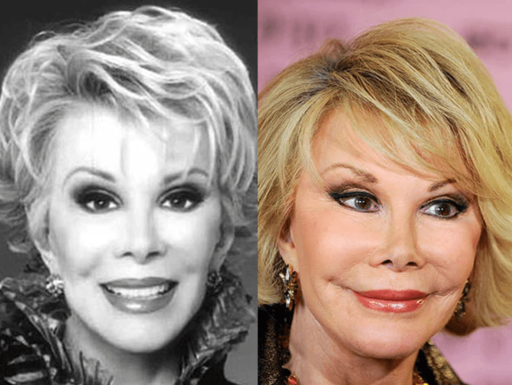 L’animatrice de télévision et humoriste Joan Rivers a parlé ouvertement de ses nombreuses interventions chirurgicales, notamment des liftings du visage, du cou et des corrections des paupières. Malgré les critiques, l’actrice a souligné qu’elle n’en ressentait aucune gêne. Le Dr Marx note que, même si beaucoup considéraient son apparence comme excessive, Joan Rivers est restée « une figure marquante, tant sur le plan professionnel que physique ».